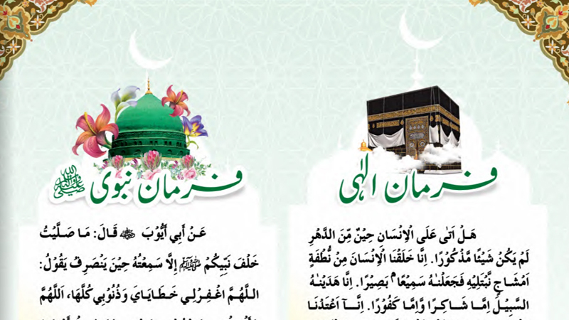 ’’بے شک انسان پر زمانے کا ایک ایسا وقت بھی گزر چکا ہے کہ وہ کوئی قابلِ ذِکر چیز ہی نہ تھا۔ بے شک ہم نے انسان کو مخلوط نطفہ سے پیدا فرمایا جسے ہم (تولّد تک ایک مرحلہ سے دوسرے مرحلہ کی طرف) پلٹتے اور جانچتے رہتے ہیں، پس ہم نے اسے (ترتیب سے) سننے والا (پھر) دیکھنے والا بنایا ہے۔ بے شک ہم نے اسے (حق وباطل میں تمیز کرنے کے لیے شعور و بصیرت کی) راہ بھی دکھا دی، (اب) خواہ وہ شکر گزار ہو جائے یا ناشکر گزار رہے۔ بے شک ہم نے کافروں کے لیے (پائوں کی) زنجیریں اور (گردن کے) طوق اور (دوزخ کی) دہکتی آگ تیار کر رکھی ہے۔ بے شک مخلص اِطاعت گزار (شرابِ طہور کے) ایسے جام پئیں گے جس میں (خوشبو، رنگت اور لذت بڑھانے کے لیے) کافور کی آمیزش ہوگی (کافور جنت کا) ایک چشمہ ہے جس سے (خاص) بندگانِ خدا (یعنی اَولیاء اللہ) پیا کریں گے (اور) جہاں چاہیں گے (دوسروں کو پلانے کے لیے) اسے چھوٹی چھوٹی نہروں کی شکل میں بہا کر (بھی) لے جائیں گے۔‘‘