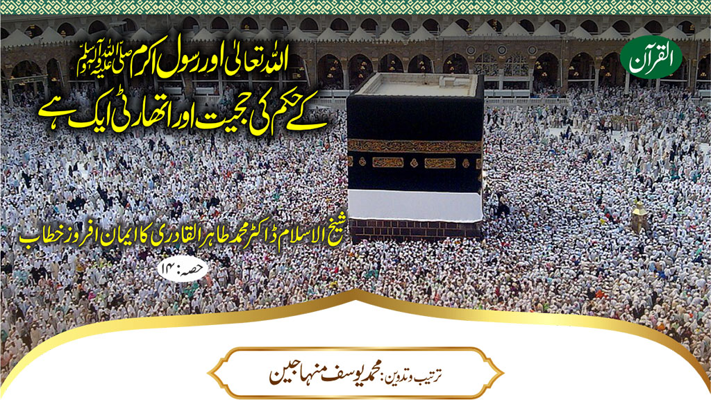 قرآن مجید نے اللہ اور رسول ﷺ دو کا ذکر کیا مگر دونوں کی نافرمانی کو ’’ان کی‘‘ کی حدود توڑنا قرار دینے کے بجائے ’’اس کی‘‘ حدود توڑنا قرار دیا۔ اس اسلوب سے واضح فرمادیا کہ ان دونوں کا حجت ہونا اور دونوں کی اطاعت و احکام کا وجوب و لزوم اپنی الگ الگ حیثیت کے ساتھ ساتھ آپس میں ضم بھی ہوجاتا ہے۔ جب اللہ اور اس کے رسول کا حکم متعین کرتے ہیں تو وہ دونوں مل کر ایک ہوجاتے ہیں۔