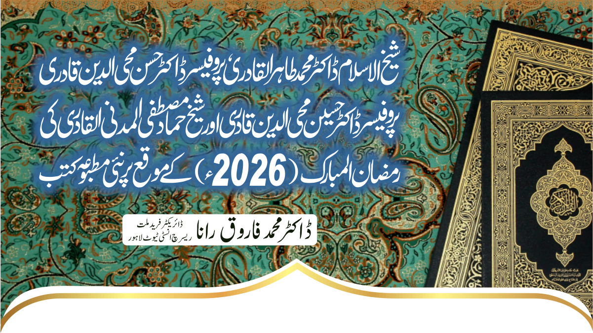 علم کی شمع جب خلوصِ نیت سے روشن ہو تو اُس کی تابانی نسلوں کو منوّر کرتی ہے۔ تحریکِ منہاج القرآن چار نسلوں سے قرآن و سنّت کی روشنی کو ہر دور کے تقاضوں سے ہم آہنگ کرتے ہوئے تجدید و اِحیاءِ دین کا فریضہ سراَنجام دے رہی ہے۔ اِسی علم پرور روایت کے تسلسل میں ماہِ رمضان المبارک 2026ء کے آخری عشرے میں شیخ الاسلام ڈاکٹر محمد طاہر القادری، پروفیسر ڈاکٹر حسن محی الدین قادری، پروفیسر ڈاکٹر حسین محی الدین قادری اور شیخ حماد مصطفی المدنی القادری کی درج ذیل نئی گراں قدر تصانیف منظرِ عام پر آئی ہیں۔ یہ کتب محض تصانیف نہیں، بلکہ اُمتِ مسلمہ کے لیے فکری سرمایہ، عملی راہ نُمائی اور روحانی زادِ راہ ہیں۔