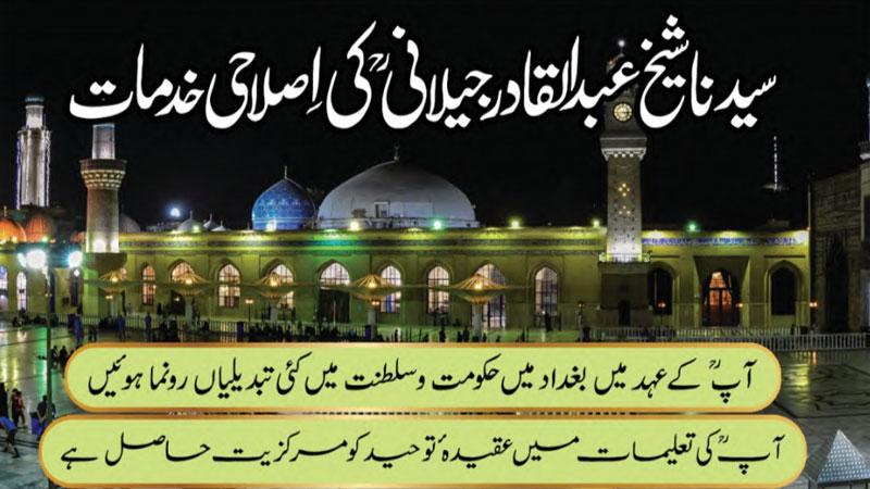 حضرت شیخ عبدالقادر جیلانی رضی اللہ عنہ اپنے زمانے کے سیاسی اور معاشرتی حالات اور دل سوز واقعات و حوادث سے بظاہر تو دور تھے لیکن اپنے شعور و احساس کو اس کے اثرات سے دور نہیں کرسکتے تھے۔ معاشرتی بگاڑ اور اخلاقی و ثقافتی خرابیاں وبائی امراض کی طرح معاشرے میں اپنی جڑیں مضبوط کررہی تھیں۔ جس کا بنیادی سبب دین سے دوری اور حبِ دنیا تھی اور حال یہ تھا ہر سو مادیت کا غلبہ تھا۔ اس پرفتن کٹھن وقت میں تجدید و احیاء دین کرنا اور اصلاح عقیدہ و عمل پر توجہ مرکوز کرنا نہ صرف ایک لابدی امر تھا بلکہ یہ ایک ہمہ جہت مرد قلندر کا تقاضا کررہا تھا۔ شیخ عبدالقادر جیلانی رضی اللہ عنہ نے اصلاح انسانیت اور تشکیل افراد کے لیے اپنی توجہ عالیہ اور نظر کیمیاء حیاتِ انسانی کے نظریاتی اور عملی پہلوؤں پر توجہ مرکوز فرمائی اور ان میں موجود فساد و خرابی کا ازالہ فرمایا۔ ذیل میں ان دونوں پہلوؤں کے حوالے سے آپ رضی اللہ عنہ کی خدمات کا تذکرہ کیا جارہا ہے:
